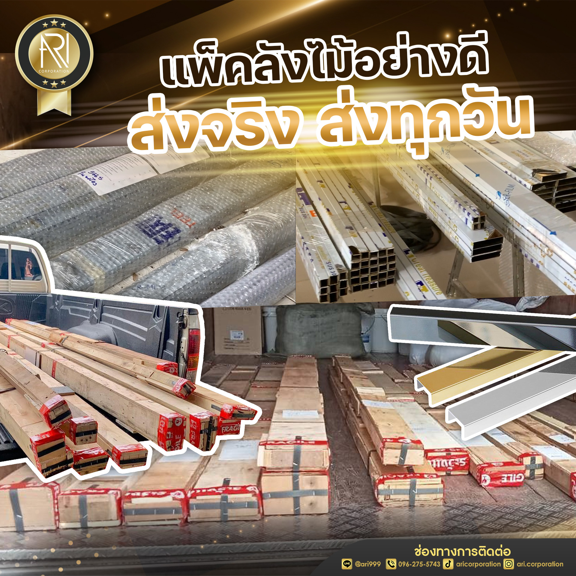 เนื่องจากคิ้วสแตนเลส ฉากสแตนเลส คิ้วกระเบื้องสแตนเลส กรุยเชิงสแตนเลส แผ่นสแตนเลสสี sus304 นั้นมีความยาวถึง 2.44 เมตร และ 3.05 เมตร และตัวสแตนเลสก็ยังต้องดูแลการจัดส่งอย่างดี เพื่อป้องกันความเสียหายกับตัวสแตนเลส อาริจึงใส่ใจทุกรายละเอียด โดยการแพ็คคิ้วสแตนเลสทุกออเดอร์ด้วยลังไม้แบบ Made to order
